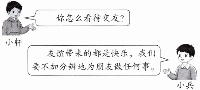 (2)小兵同学的观点是错误的。①友谊会带来快乐,有时也会带来困扰。②交友需要讲原则。友谊需要信任和忠诚,但不等于不加分辨地为朋友做任何事。当朋友做错事,甚至误入歧途时,我们要坚持正确立场、不随波逐流,并积极予以规劝,帮助朋友及时改正错误。