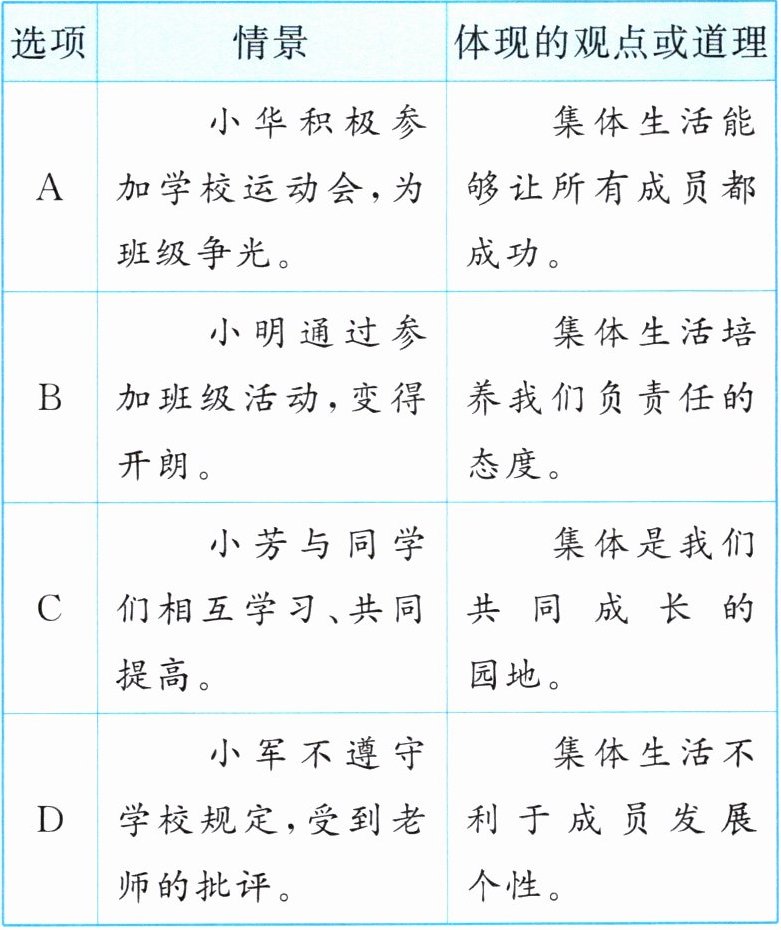 |B|小明通过参加班级活动,变得开朗。|集体生活培养我们负责任的态度。|