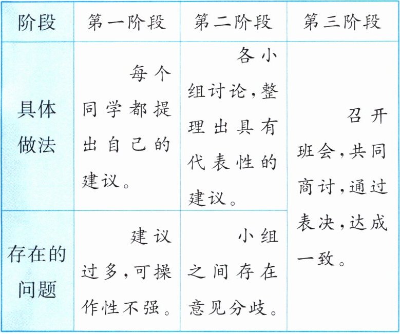 |具体做法|每个同学都提出自己的建议。|各小组讨论,整理出具有代表性的建议。|召开班会,共同商讨,通过表决,达成一致。|