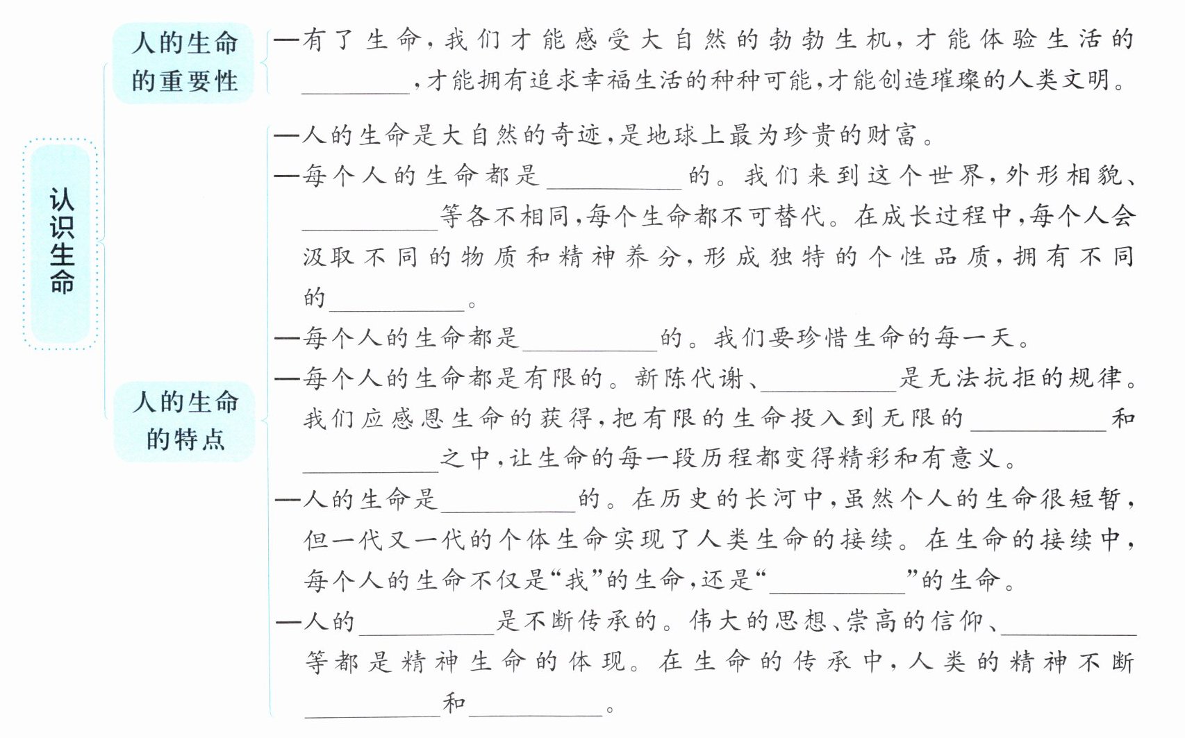 —每个人的生命都是______的。我们来到这个世界,外形相貌、______等各不相同,每个生命都不可替代。在成长过程中,每个人会汲取不同的物质和精神养分,形成独特的个性品质,拥有不同的______。