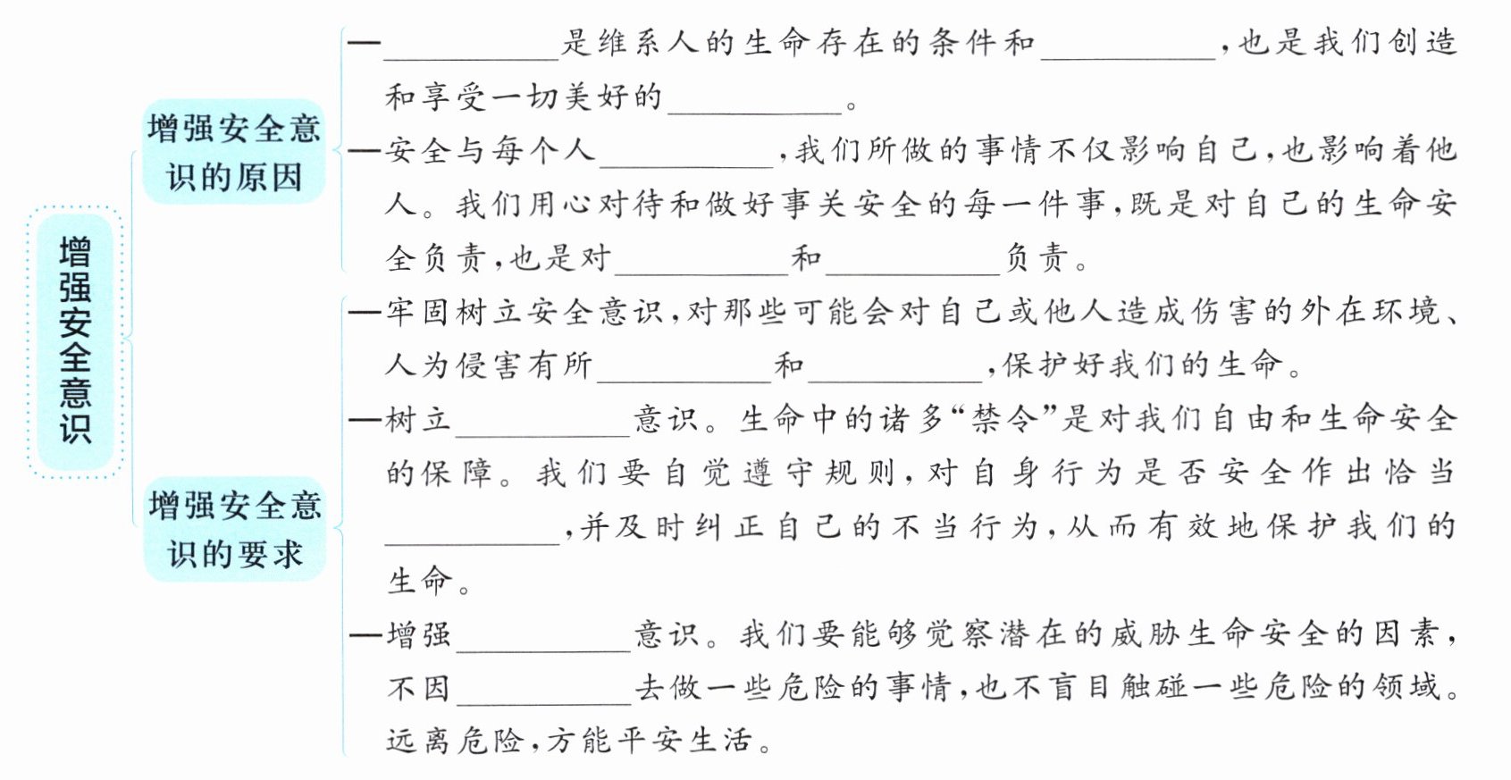 - 一树立____意识。生命中的诸多“禁令”是对我们自由和生命安全的保障。我们要自觉遵守规则,对自身行为是否安全作出恰当____,并及时纠正自己的不当行为,从而有效地保护我们的生命。