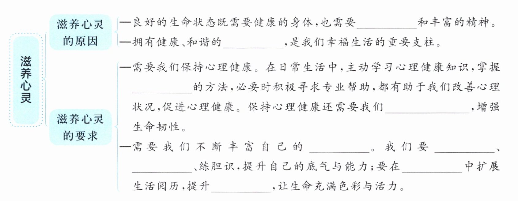 |滋养心灵的要求|需要我们保持心理健康。在日常生活中,主动学习心理健康知识,掌握____的方法,必要时积极寻求专业帮助,都有助于我们改善心理状况,促进心理健康。保持心理健康还需要我们____,增强生命韧性。需要我们不断丰富自己的____。我们要____、____、练胆识,提升自己的底气与能力;要在____中扩展生活阅历,提升____,让生命充满色彩与活力。|