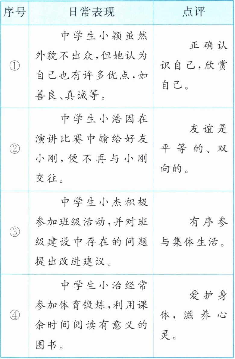 |④|中学生小治经常参加体育锻炼,利用课余时间阅读有意义的图书。|爱护身体,滋养心灵。|
