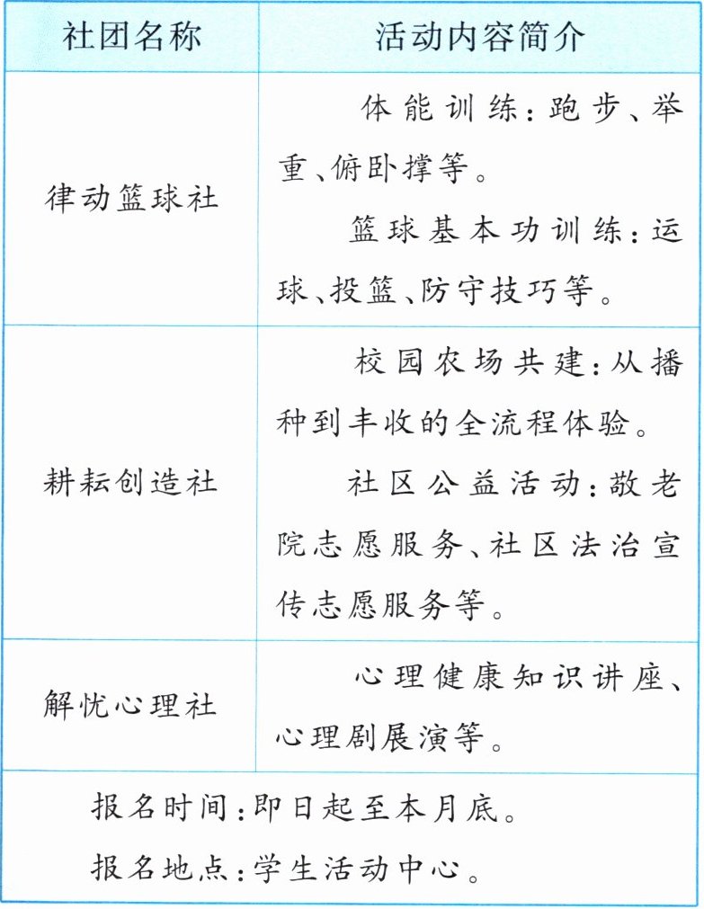 (1)根据海报内容,谈谈这些社团开展的活动对学生成长有何益处。(6 分)