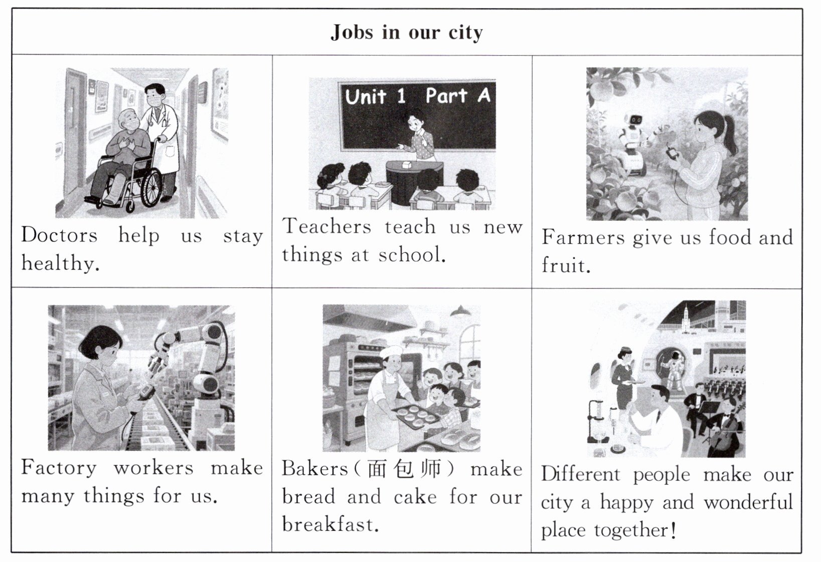 (医生守护健康,老师传授知识,农民供应蔬果,工人制造产品,面包师烘焙美味糕点……正因他们,城市才能温暖有序地运转。)请你阅读绘本故事《Jobs in our city》。