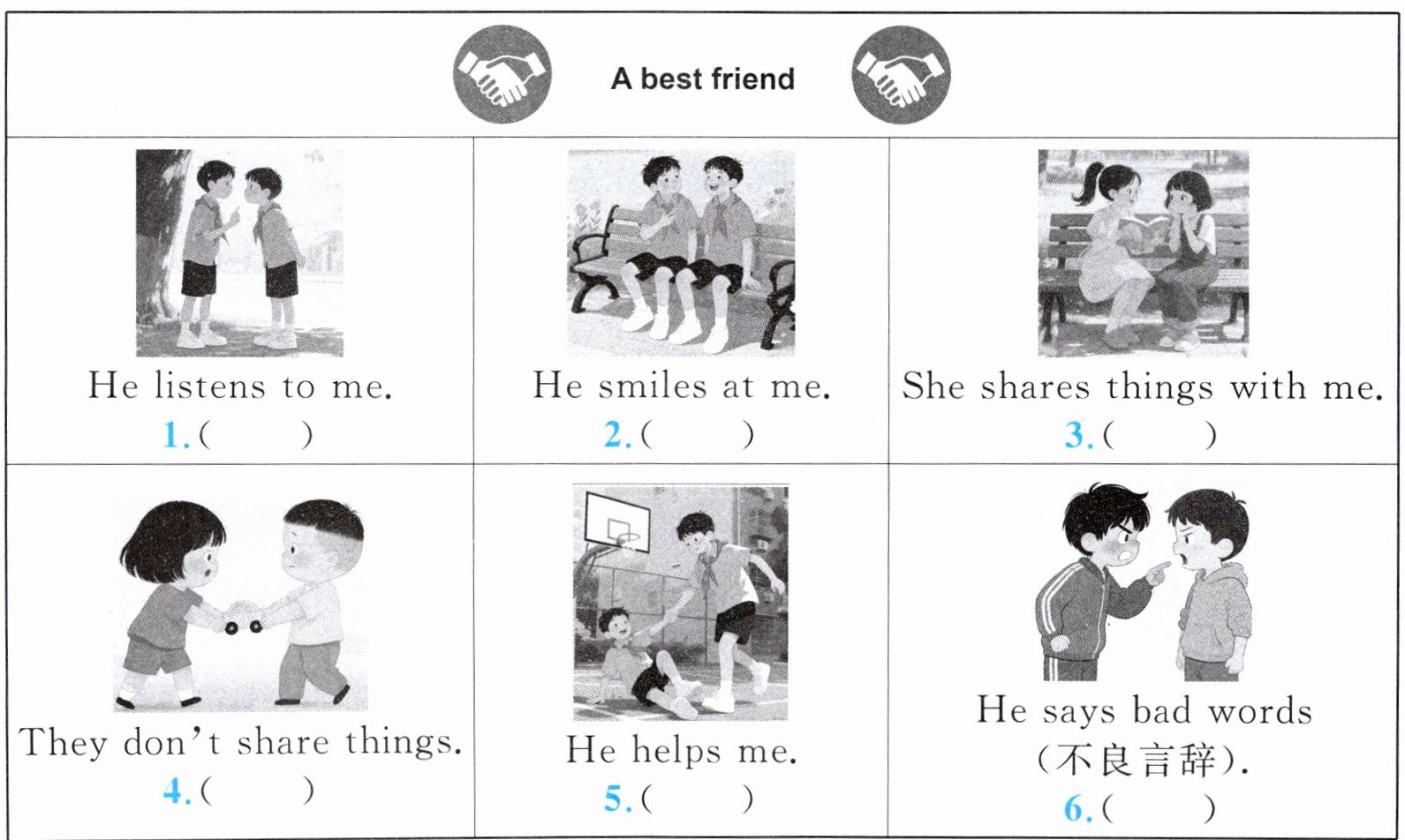 三、(测一测:你是个合格的好朋友吗?)看图,判断下列行为是(√)否(×)是好朋友应该做的。