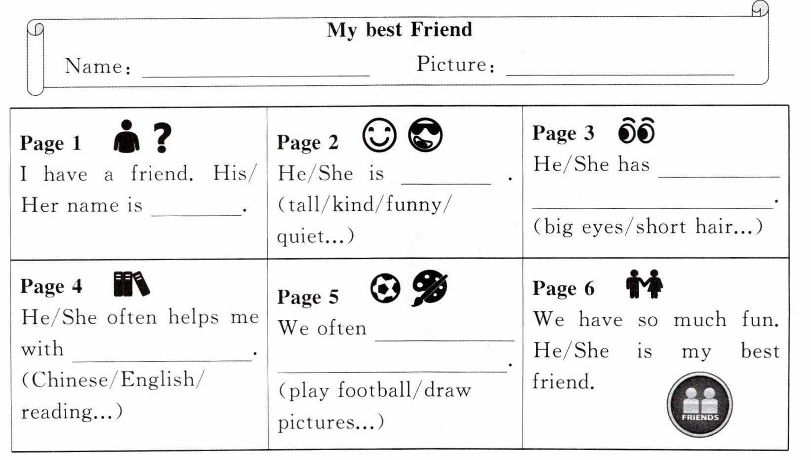 任务二:制作“My Best Friend”翻翻书。快来用以下句式描述你的好朋友吧。