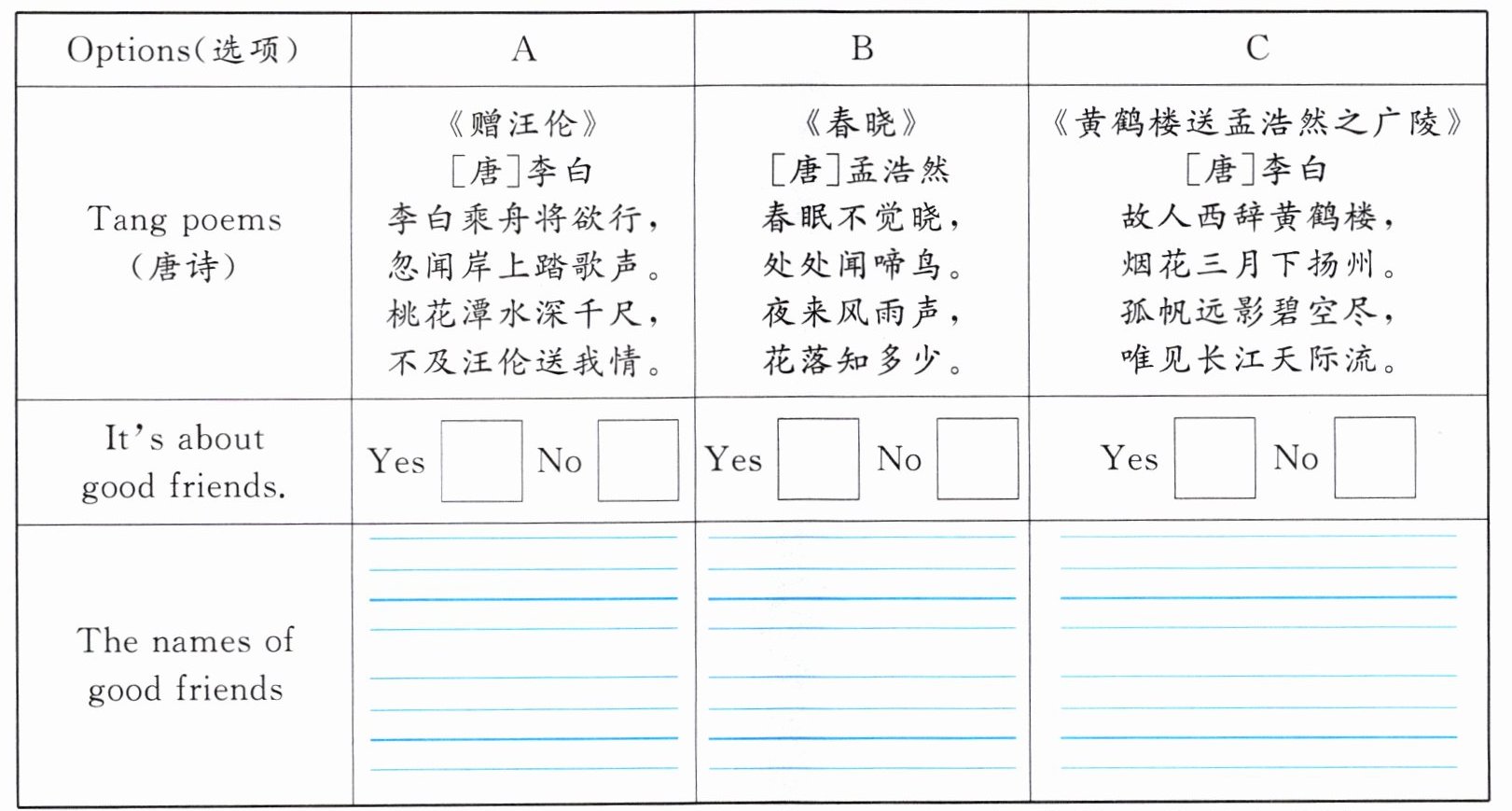 任务一:古诗里的友谊。判断下面哪两首唐诗是关于“good friends”的,在相应的方框里画“√”,并在四线三格里用英文写出诗中提到的两对朋友的名字。