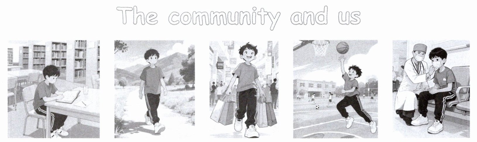 一、(居民可以自由参加丰富多彩的社区活动,让生活更有趣。)给下列图片选择正确的短语选项。