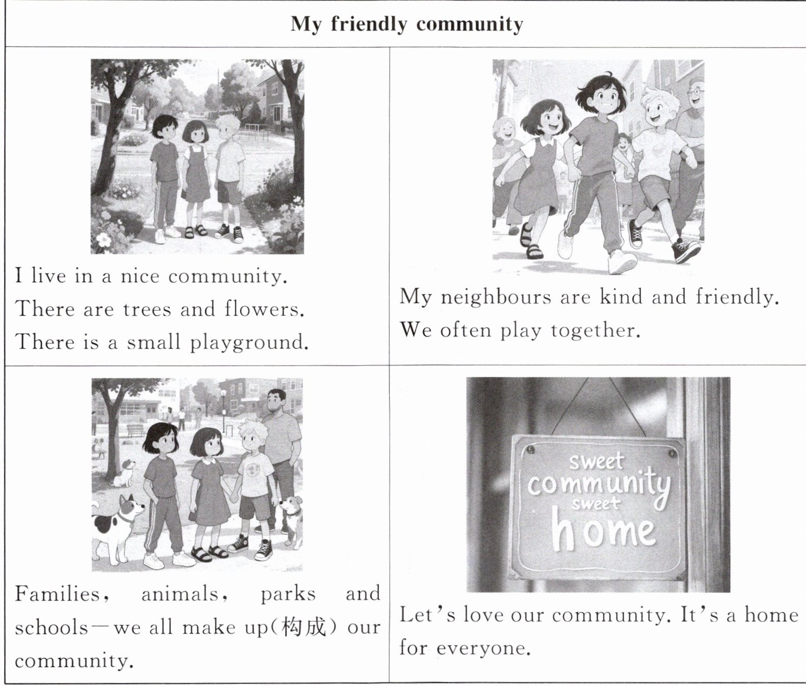 (邻里和睦互助,环境优美宜人,构成了我们共同热爱的美好家园。)请你阅读绘本故事《My friendly community》。