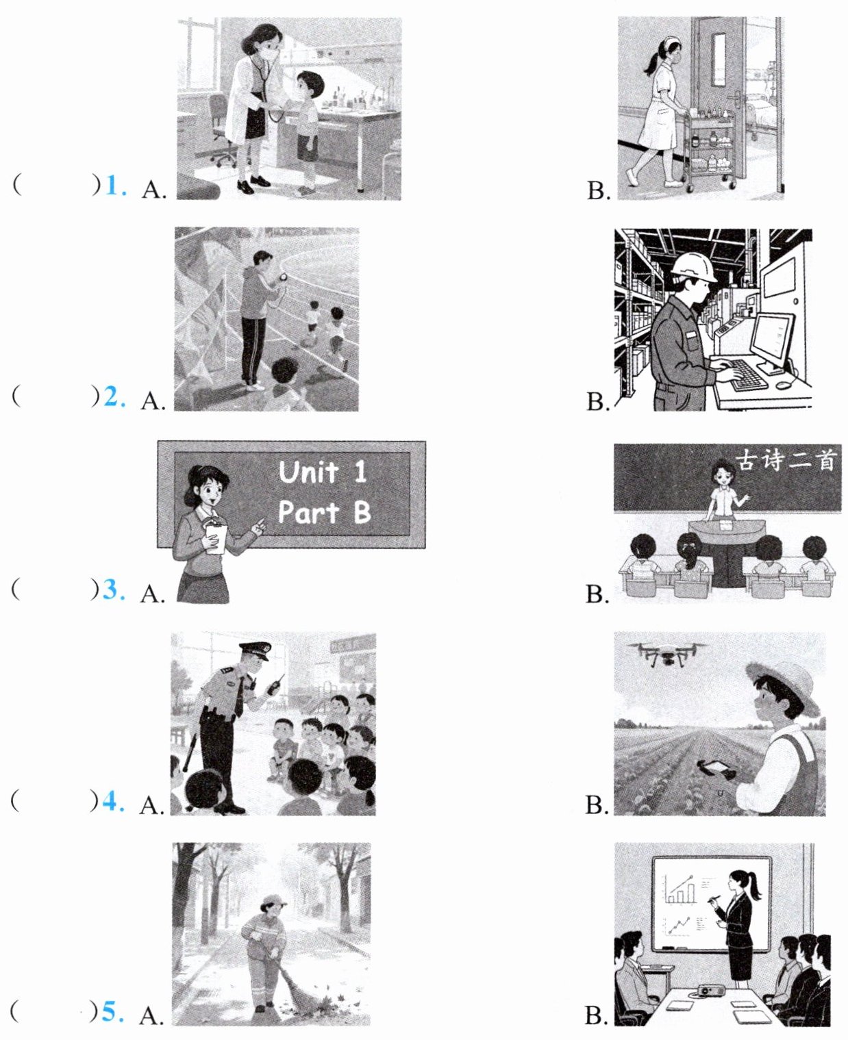 四、(两名同学在班级“家庭职业分享会”上交流。)听长对话,用数字1~5给下列句子排序。(读三遍)