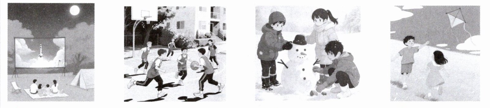 一、(不同天气下的趣味活动选择。)给下列图片选择正确的短语选项。