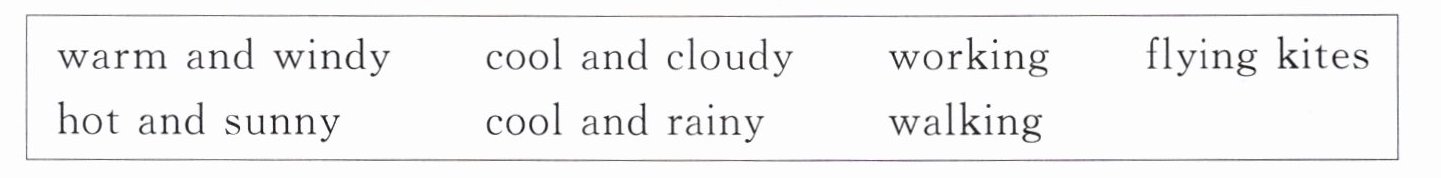 1. warm and windy 2. flying kites 3. hot and sunny 4. working 5. cool and rainy 6. walking 7. cool and cloudy