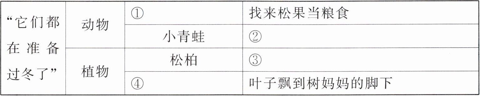 1.抓紧 2.①小松鼠 ②加紧挖洞 ③穿上厚厚的、油亮亮的衣裳 ④杨树、柳树 3.过冬