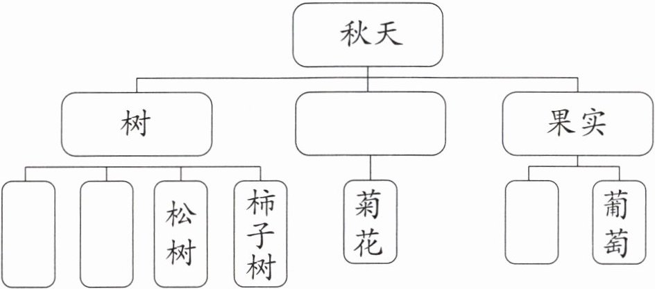 1.彩色蝴蝶 2.秋天果实累累,景色迷人,我喜欢秋天。 3.杨树 枫树 花 柿子 4.示例:秋风掠过树梢,金黄的银杏叶铺满小径,仿佛给大地织了一条灿烂的地毯。果园里,红彤彤的柿子挂满枝头,空气中弥漫着香甜的气息,处处洋溢着人们丰收的喜悦。