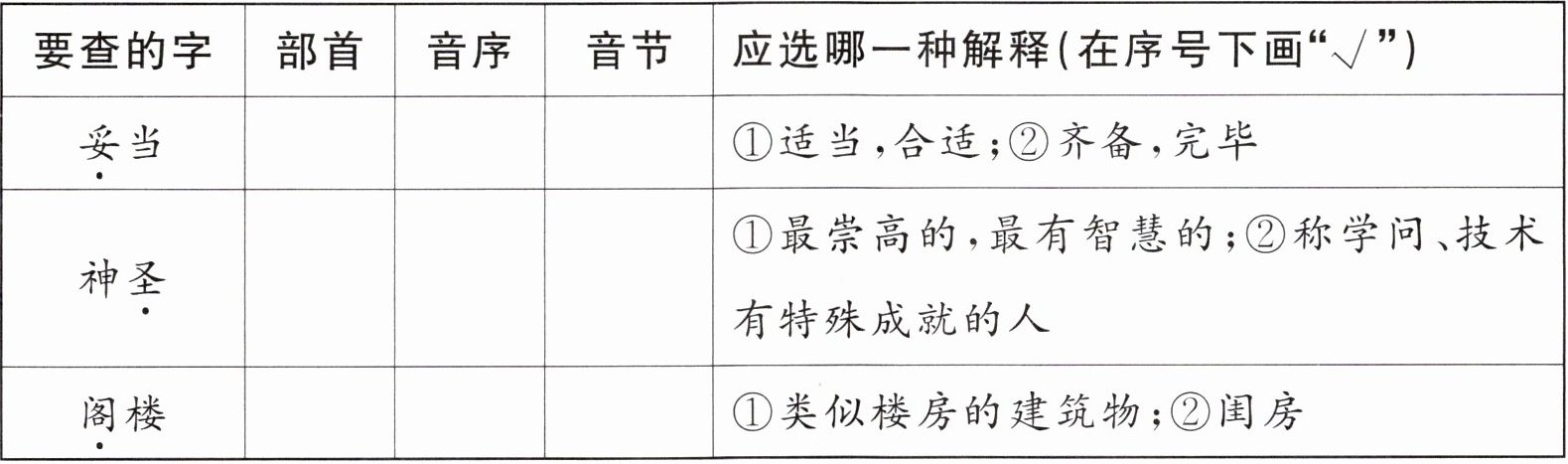|要查的字|部首|音序|音节|应选哪一种解释(在序号下画“√”)|
