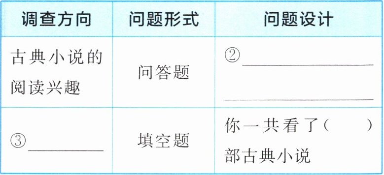 (1)【设·调查问卷】班级将通过调查问卷来了解同学们阅读中国古典小说的相关情况,请你依据提示,补充完成下面的调查问卷设计表。(3 分)