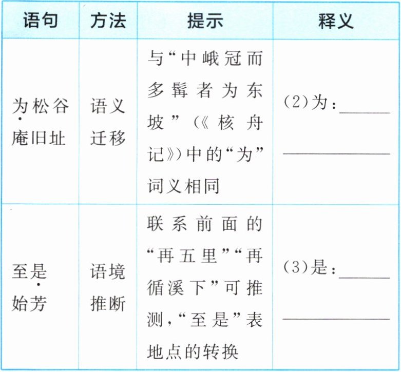 始芳|语境推断|联系前面的“再五里”“再循溪下”可推测,“至是”表地点的转换|(3)是:______|6. 请用现代汉语翻译下面句子。