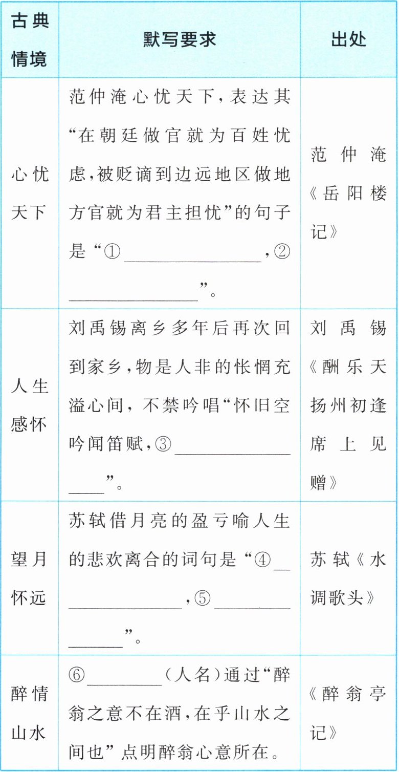 6. 古典诗文藏意趣,多元情境品风流。请在下表中按要求填写相关内容。(6 分)
