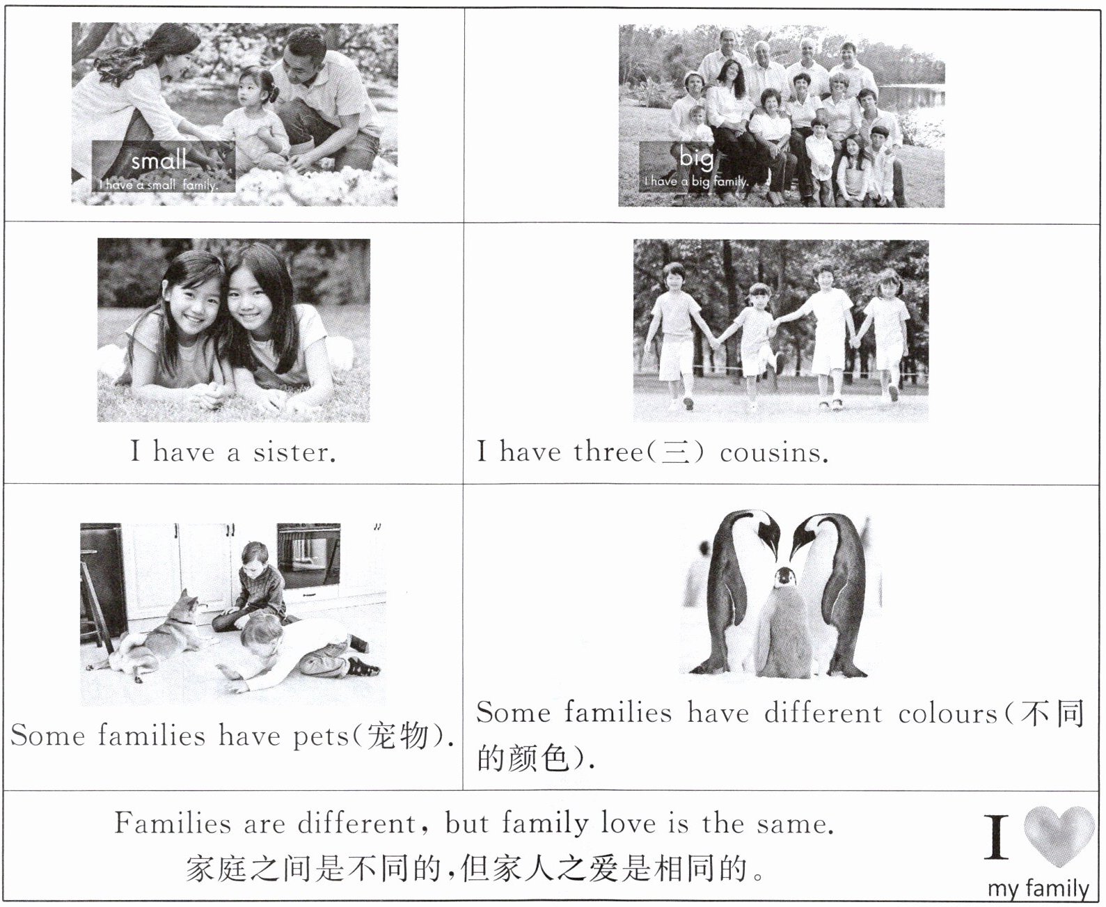 (家庭虽有大小之别,成员各异,但都洋溢着温馨与欢乐。)选词填空。
