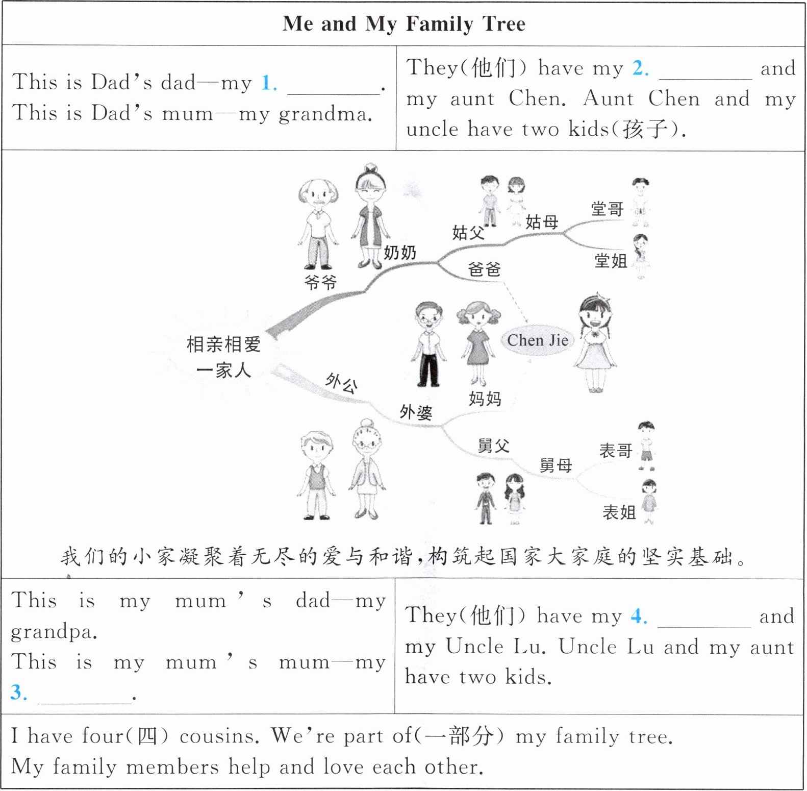 (为了更好地理解并理顺与同学们相关的家人亲戚关系,以便在平时或者过年时走亲访友更加得心应手,老师请同学们绘制属于自己的家庭树来形象地展示这些关系。)请你帮助 Chen Jie 完成“家庭树”这一任务。