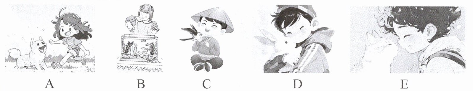 一、(同学们积极参与宠物领养日活动,热心为流浪动物寻找新家。)给下列句子选择相符的图片。