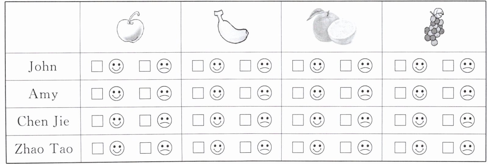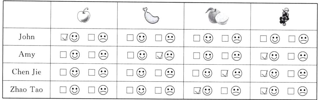 二、(同学们品尝了刚采摘的水果,热烈讨论各自对水果的喜好。)阅读对话,在对应的方框里画“√”,完成调查统计表。