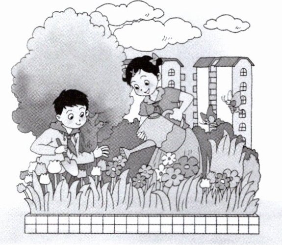 一、(两名同学讨论校园绿化维护计划。)情境交际。根据图片提示,从方框里选择恰当的句子,补全对话。