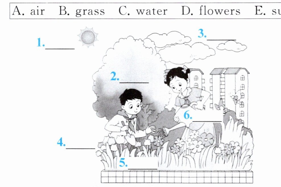 )1.Plants need air,____ and sun.A. water