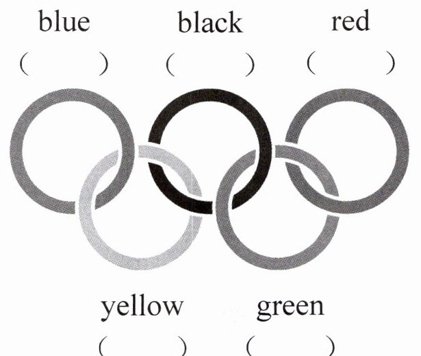 一、(你能说出奥运会会旗有哪五种颜色吗?)听单词,用数字 1~5 在下图中标序号。(读两遍)