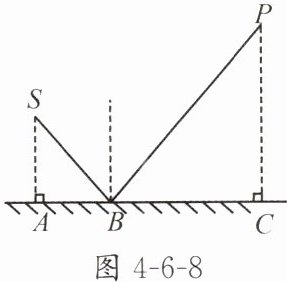 5. 如图 4 - 6 - 8,光源 S 发出的光线照在平面镜的点 B 处. 若在 P 点看到光源的反射光线,测得 AB = 6 m,BC = 12 m. PC⊥AC,且 PC = 14 m,则光源 S 到平面镜的距离,即 SA 的长度为