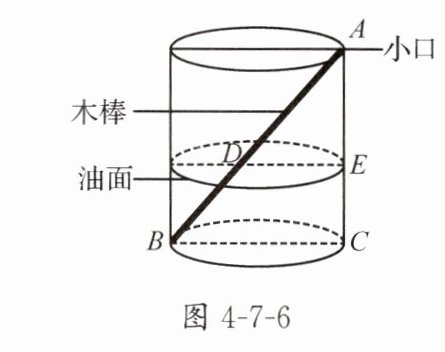 【拓展提升】如图 4-7-6,一圆柱形油桶,高 1.5 m,用一根长 2 m 的木棒从桶盖小口 A 处恰好斜插入桶内另一端的 B 处,抽出木棒后,量得上面没浸油的部分长 1.2 m,求桶内油面的高度.