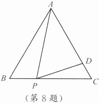8. 如图,在等边三角形 ABC 中,P 为边 BC 上一点,D 为边 AC 上一点,且∠APD = 60°. 若 AB = 3,CD = $\frac{2}{3}$,求△ABP 与△PCD 的周长比.