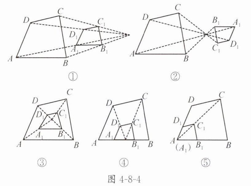 下面有五个图形,每个图形中的四边形 $ ABCD $ 和四边形 $ A_1B_1C_1D_1 $ 都是相似图形. 分别观察这五个图形,回答下列问题: