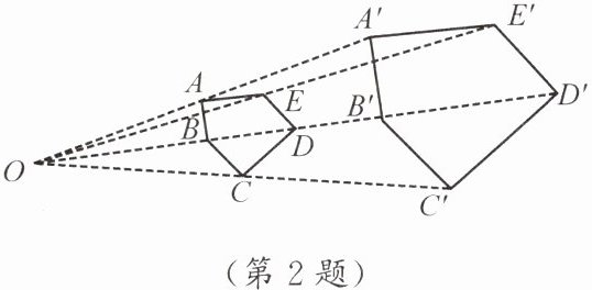 2. 如图,以点 $ O $ 为位似中心,将五边形 $ ABCDE $ 放大后得到五边形 $ A'B'C'D'E' $. 已知 $ OA = 5 cm $,$ OA' = 10 cm $,则五边形 $ ABCDE $ 的周长与五边形 $ A'B'C'D'E' $ 的周长的比值是