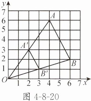 3. 如图 4-8-20,$\triangle ABO缩小后变为\triangle A'B'O$,其中 $A$,$B$ 的对应点分别为 $A'$,$B'$,且 $A'$,$B'$ 均在图中格点上. 若线段 $AB$ 上有一点 $P(m,n)$,则点 $P$ 在 $A'B'$ 上的对应点 $P'$ 的坐标为(