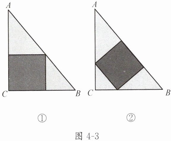 题图4-3①中正方形的两条边与直角三角形的两条直角边重合,有一个顶点在斜边上,用相似比求得正方形的边长是$\frac{12}{7}$;题图4-3②中正方形的一条边与直角三角形的斜边重合,有两个顶点在两条直角边上,用相似比求得正方形的边长是$\frac{60}{37}$.因为$\frac{12}{7}=\frac{60}{35}>\frac{60}{37}$,所以题图4-3①剪下的正方形铁片的面积较大.