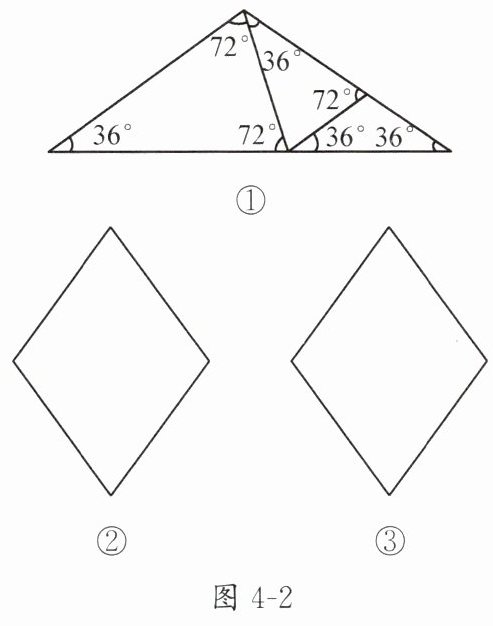 顶角为 $36^{\circ}$ 的等腰三角形称为黄金三角形. 如图 4 - 2①是一个底角为 $36^{\circ}$ 的等腰三角形,我们可以用图示的分割方法继续下去,可以得到若干个黄金三角形. 现有锐角为 $72^{\circ}$ 的菱形(如图 4 - 2②、图 4 - 2③),你能仿照以上的分割方法作出黄金三角形吗?(请在图 4 - 2②、图 4 - 2③中画出符合条件的两种分割方法)