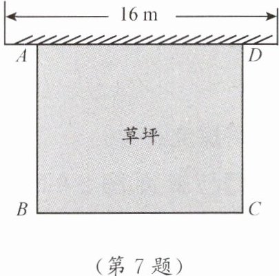 7. 如图,某幼儿园有一面长16m的墙,计划用32m长的围栏靠墙围成一个面积为$120m^2$的矩形草坪ABCD,求该矩形草坪BC边的长.