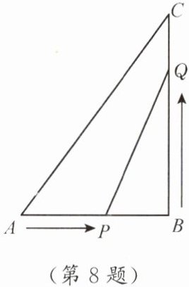 $8. $如图$,$在$△ABC$中$,∠B= 90°,AB= 6cm,BC= 8cm,$点$P$从点$A$开始沿边$AB$向点$B$以$1cm/s$的速度移动$,$点$Q$从点$B$开始沿边$BC$向点$C$以$2cm/s$的速度移动$.$如果点$P,Q$分别从点$A,B$同时出发$,$当点$Q$运动到点$C$时$,$两点停止移动$.$多长时间后$,$点$P,Q$之间的距离是$4\sqrt2cm?$