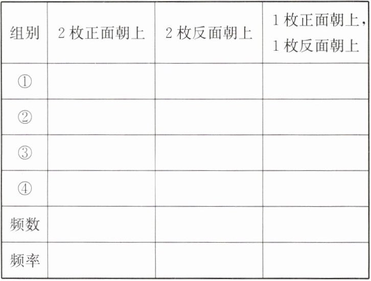 请你准备 2 枚新硬币(2 枚一角、2 枚五角或 2 枚一元),两人一组,一人抛掷,另一人统计结果,然后由组长汇总正面朝上和反面朝上的次数。