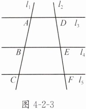 1. 如图 4 - 2 - 3,任意画两条直线 $ l_1 $,$ l_2 $,再画三条与 $ l_1 $,$ l_2 $ 相交的平行线 $ l_3 $,$ l_4 $,$ l_5 $,分别测量 $ l_3 $,$ l_4 $,$ l_5 $ 在 $ l_1 $ 上截得的两条线段 $ AB $,$ BC $ 和在 $ l_2 $ 上截得的两条线段 $ DE $,$ EF $ 的长度,$ AB:BC $ 与 $ DE:EF $ 相等吗?任意平移 $ l_5 $,再测量 $ AB $,$ BC $,$ DE $,$ EF $ 的长度,$ AB:BC $ 与 $ DE:EF $ 相等吗?