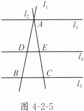 在图$4 - 2 - 5$中,$l_{3}// l_{4}// l_{5}$,截$l_{1}$、$l_{2}$两条直线,所以$\frac{AD}{AB}=\frac{AE}{AC}$等(对应线段的比相等)。