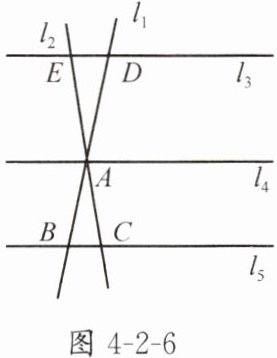 2. 如图 4 - 2 - 6,$ l_1 $,$ l_2 $ 是两条相交直线,交点 $ A $ 刚好落到直线 $ l_4 $ 上,且 $ l_3 // l_4 // l_5 $,所得的对应线段的比相等吗?依据是什么?