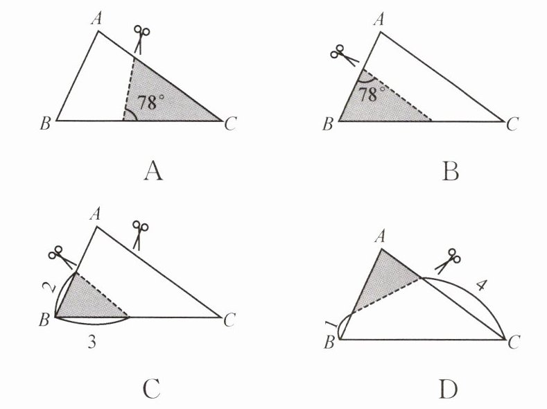3. 如图 4-5-5,在 $\triangle ABC$ 中,$\angle A= 78^{\circ}$,$AB= 4$,$AC= 6$. 将 $\triangle ABC$ 沿如图所示的虚线剪开,剪下的阴影三角形与原三角形不相似的是(