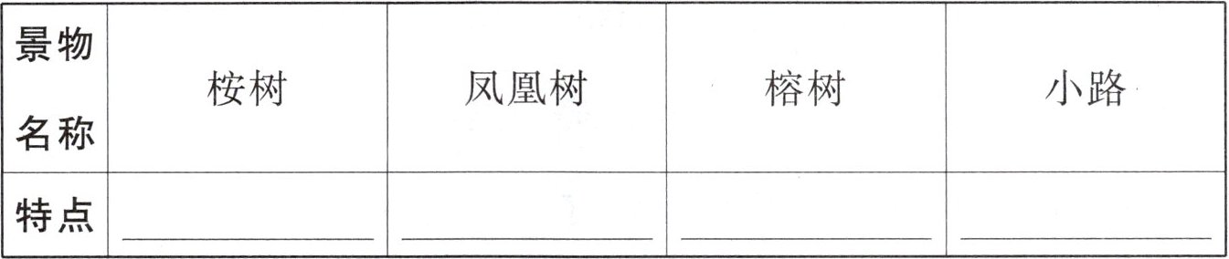 2. 文中画横线的句子把____比作____,生动形象地刻画了榕树的形状。这样的句子我也会写:____。