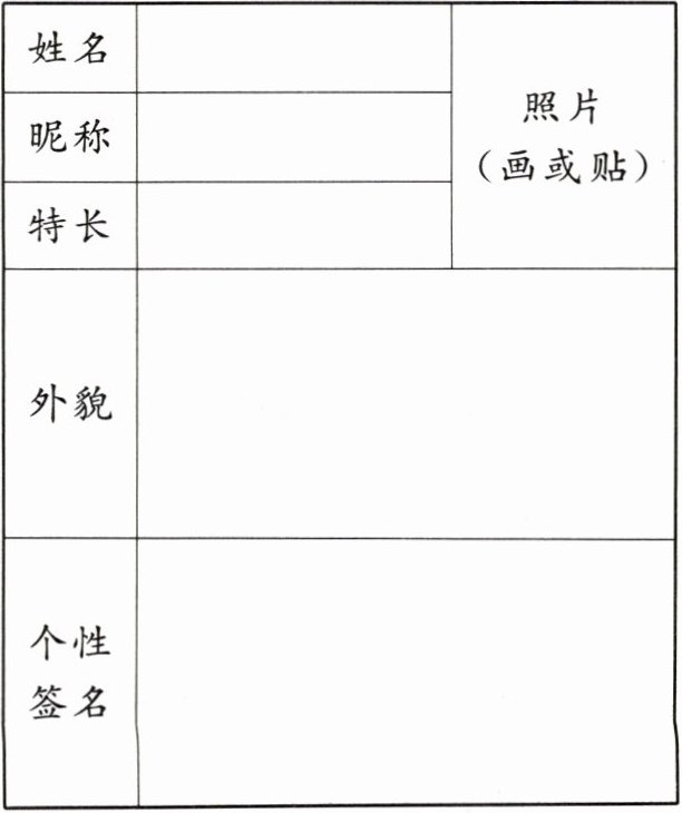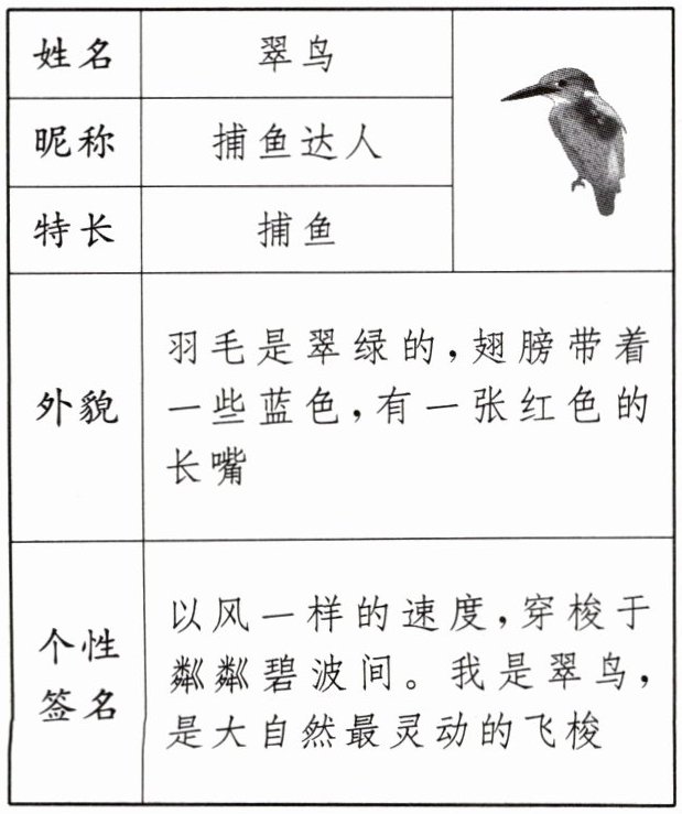 3 请你仿照“翠鸟身份证”,从你观察过的动物朋友中选择一个,为其注册“身份证”吧!