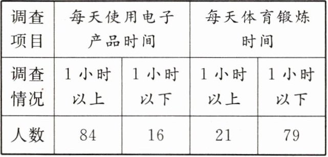 某小学五年级100名学生使用电子产品、体育锻炼情况调查表