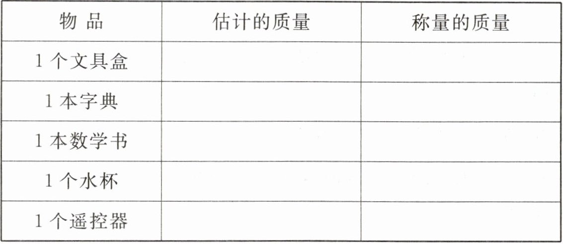 | $1$个文具盒 | $100$克(答案不唯一) | 实际称量或用盐比较得出(根据实际情况填写) |