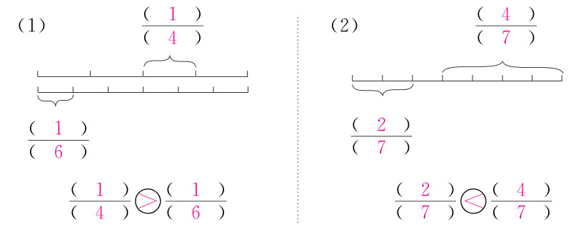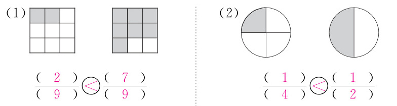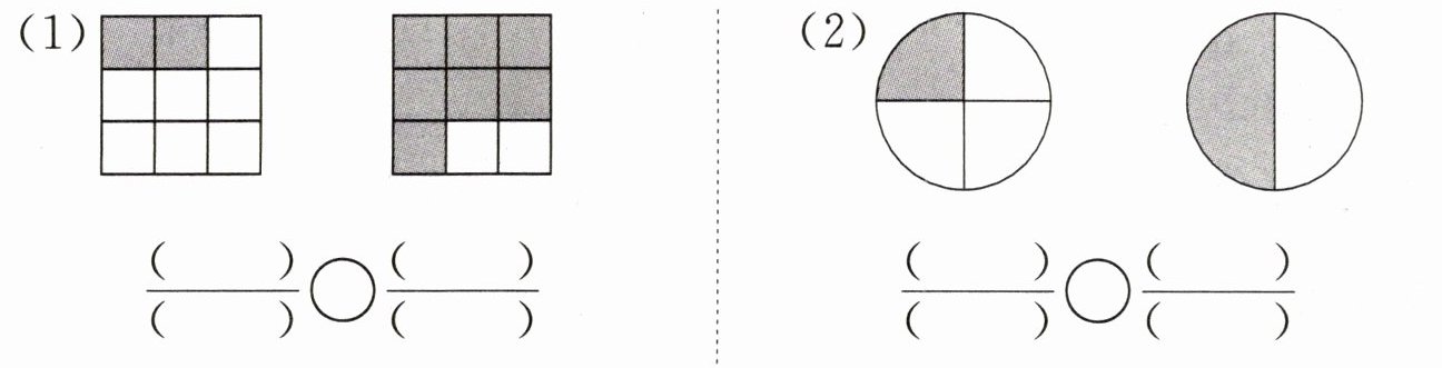 1. 把下面各图中的涂色部分用分数表示出来,再比较每组分数的大小。